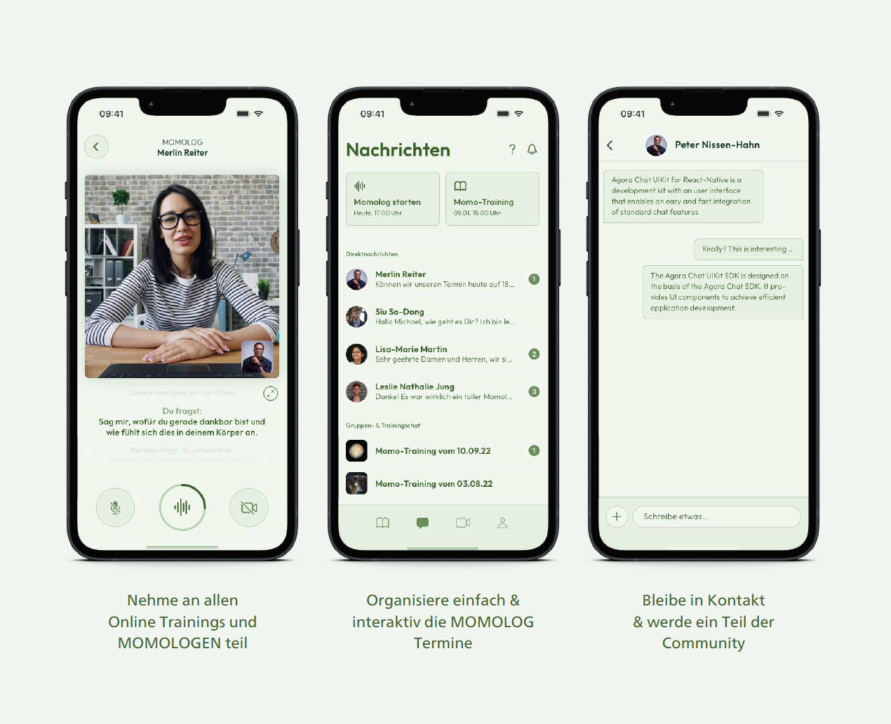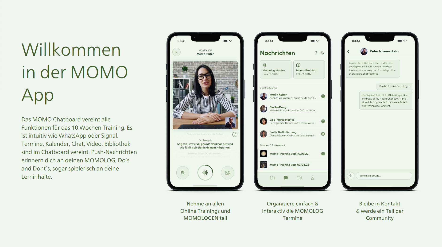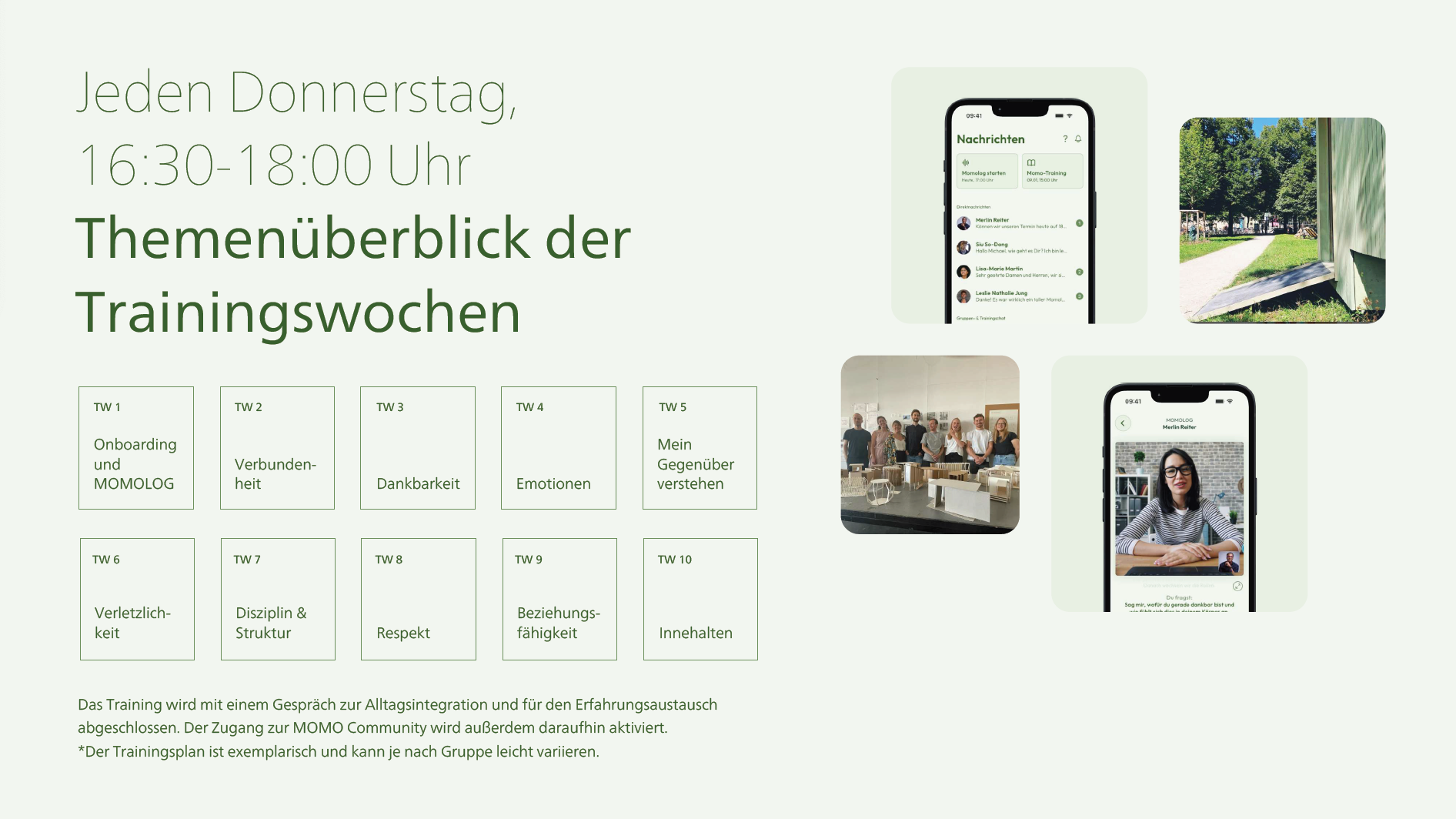 10 x wöchentliche 75-minütige von Trainer:innen geleitete Live-Online-Trainings mit relevanten Inhalten für deine Weiterentwicklung, wie beispielsweise Dankbarkeit, Emotionen und Respekt immer Donnerstag von 17.30-18.45 Uhr. Die Session werden auch aufgezeichnet und sind dann in der Bibliothek der MOMO App verfügbar. So kann man bei Urlaub, Krankheit oder sonstigen Gründen jederzeit in Ruhe nach-schauen.